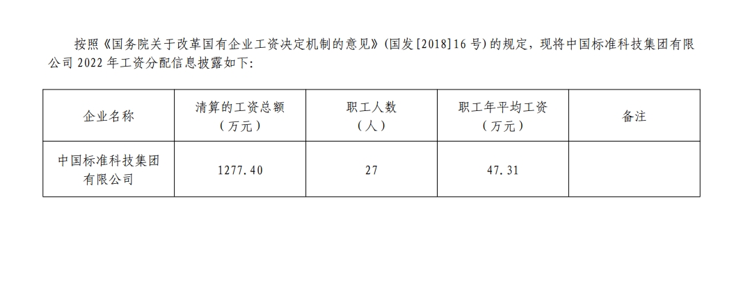2022年中國(guó)標(biāo)準(zhǔn)科技集團(tuán)有限公司工資分配信息披露
