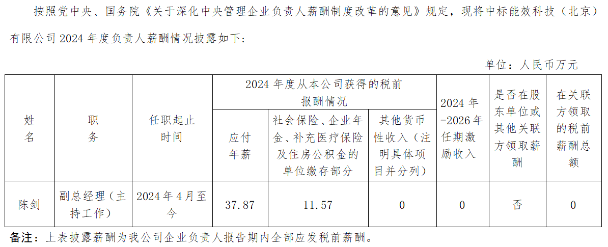 中標能效科技(北京)有限公司企業負責人2024年度薪酬情況