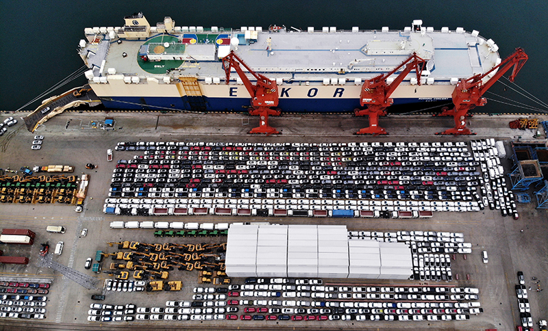 商品車在山東港口青島港碼頭等候裝船(2022年8月7日攝,無人機(jī)照片)。新華社記者 李紫恒 攝