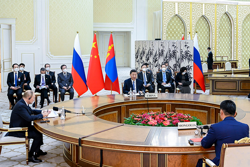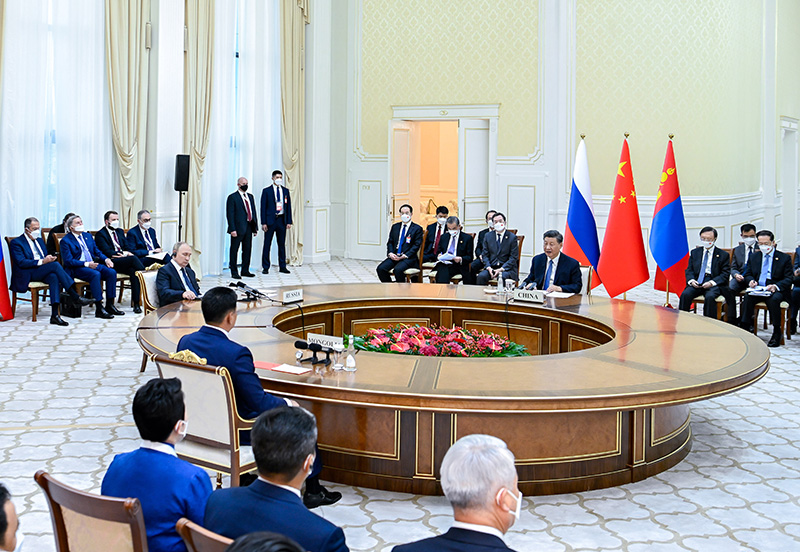 當地時間9月15日下午,國家主席習近平在撒馬爾罕國賓館同俄羅斯總統普京、蒙古國總統呼日勒蘇赫舉行中俄蒙三國元首第六次會晤。新華社記者 翟健嵐 攝