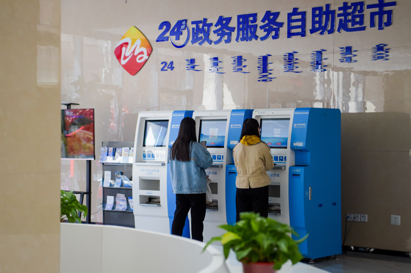 在內(nèi)蒙古自治區(qū)呼和浩特市玉泉區(qū)政務(wù)服務(wù)中心的“24小時(shí)政務(wù)服務(wù)自助超市”,市民在自助辦理發(fā)票業(yè)務(wù)(2022年4月2日攝)。新華社記者 李志鵬 攝
