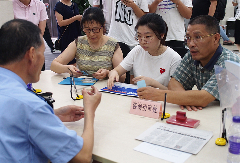 在上海市閔行區(qū)證照辦理中心,民警在解答有關(guān)為香港居民辦理居住證的手續(xù)問題(2018年9月1日攝)。新華社記者 任瓏 攝