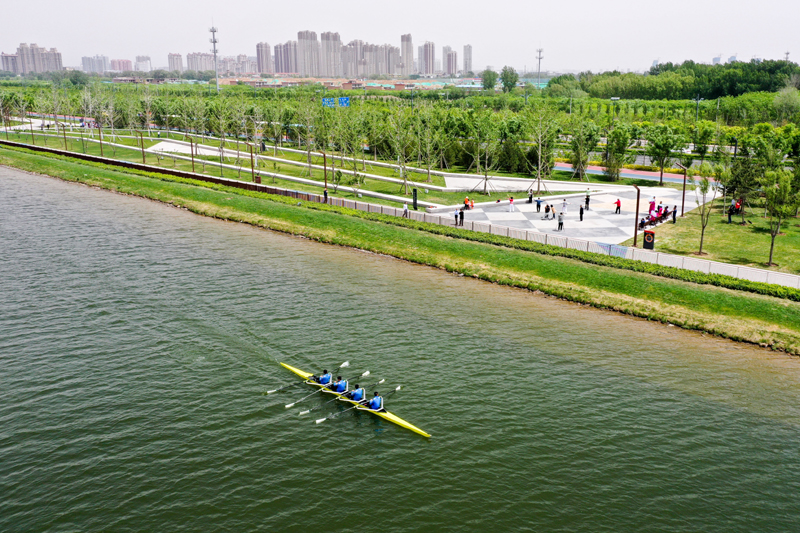 山西皮劃艇隊(duì)隊(duì)員在汾河太原城區(qū)晉陽(yáng)橋段水面上訓(xùn)練(2020年5月12日攝,無(wú)人機(jī)照片)。新華社記者 曹陽(yáng) 攝
