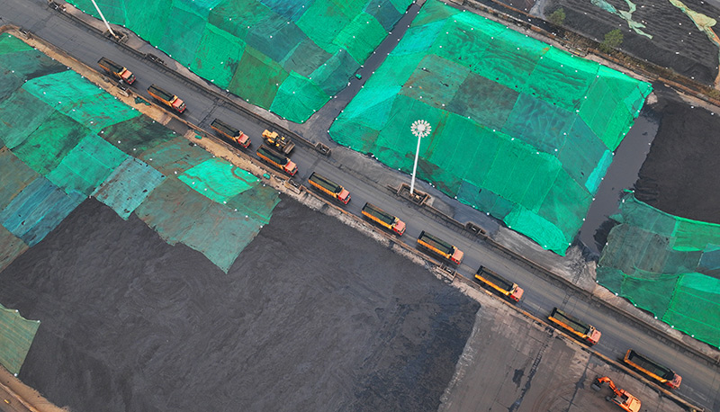 11月28日,在江蘇連云港港煤炭碼頭,車(chē)輛在轉(zhuǎn)運(yùn)到港的電煤(無(wú)人機(jī)照片)。