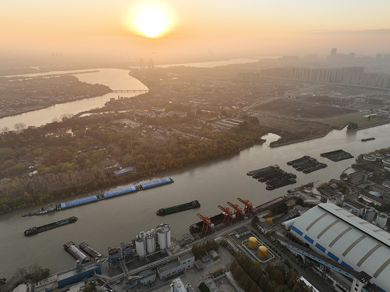11月28日,運(yùn)輸電煤的船舶經(jīng)過(guò)京杭大運(yùn)河揚(yáng)州段(無(wú)人機(jī)照片)。